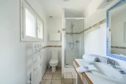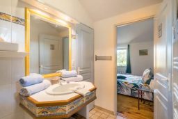 A l'étage : 1 chambre familiale (lit 160 x 200) , accès espace enfants (2 lits 90 x 190), les 2 chambres communiquent avec une salle de douche (douche, wc, lavabo); une autre chambre (lit 160 x 200) avec une salle de douche (douche, wc, lavabo); un grand pallier avec espace détente (bureau pour les enfants, canapé et bibliothèque)