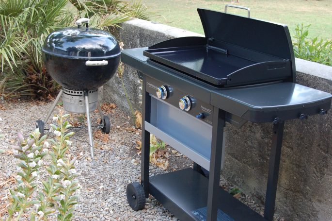 Sue la terrasse du gîte, plancha au gaz (gaz fourni) et BBQ Weber au charbon de bois (non fourni)