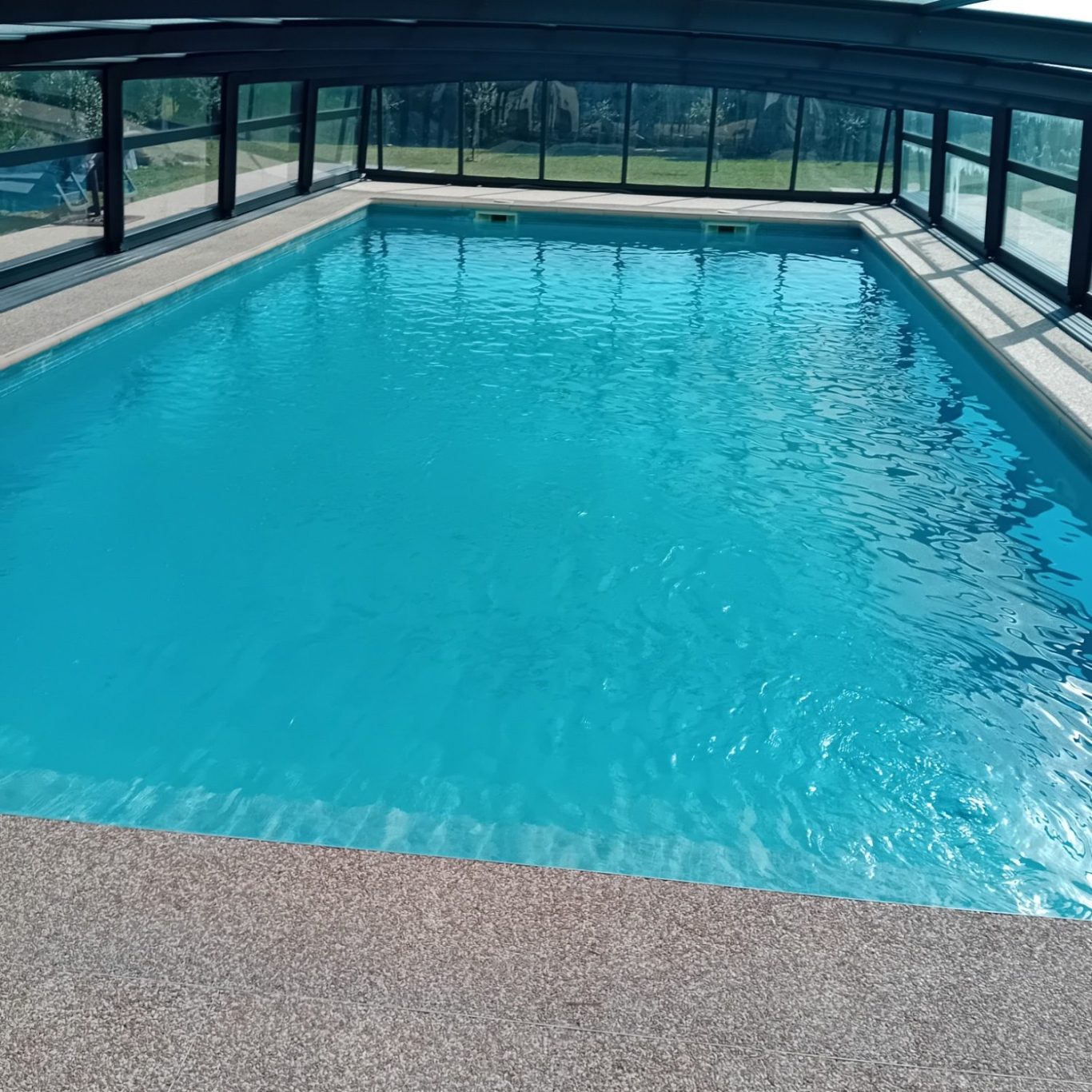 Vous profiterez d'une piscine chauffée pour un confort optimal avec un abri mi-haut (1m80 au plus haut).