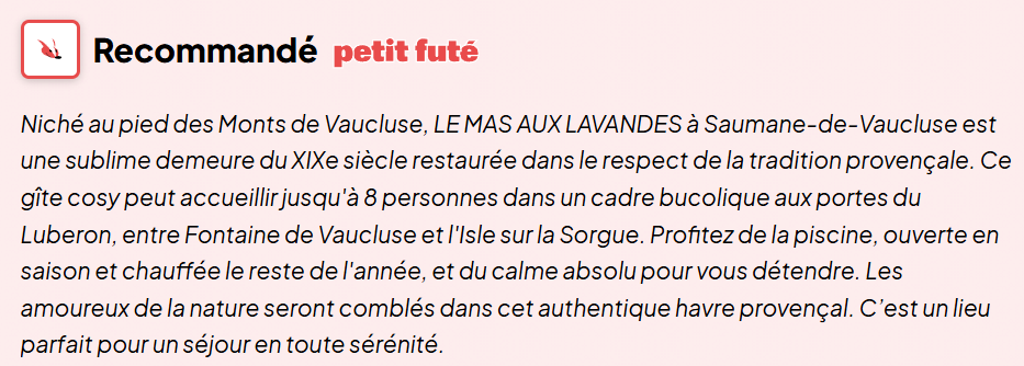 Un séjour exceptionnel ! Nous ne pouvons que recommander le mas des lavandes et pour cause à peine notre séjour fini nous avons déjà réservé nos prochaines vacances au mas :)